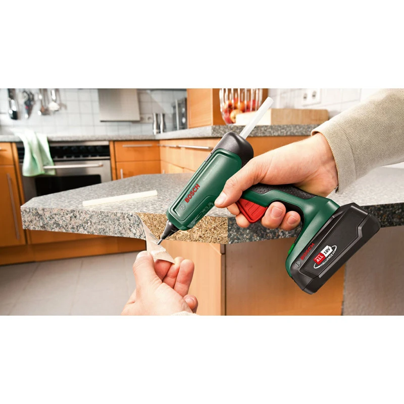L’AdvancedGlue 18V est un pistolet a colle sans fil puissant, aussi performant qu’un outil filaire, et compatible avec le systeme de batteries 18V Bosch. Le pistolet a colle est pret a l’emploi apres un temps de chauffe de seulement 90 secondes. Doté de la technologie de chauffage a haute température constante Bosch, il réalise des collages puissants pour des assemblages parfaits et laisse suffisamment de temps pour pouvoir corriger la position des pieces a coller. Deux températures au choix : 200 °C pour une adhésion parfaite des pieces lors de travaux de bricolage ou réparation et 130 °C pour les projets avec matériaux sensibles a la chaleur. Cet outil fait aussi économiser de l’énergie en s’éteignant automatiquement apres une certaine durée d’inactivité.