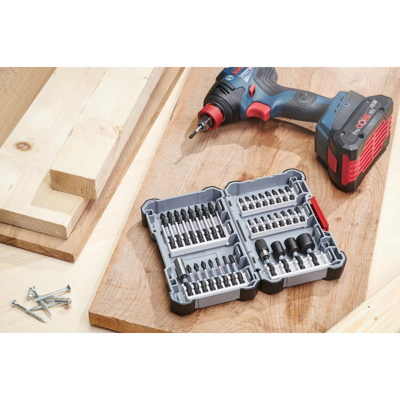 Le coffret fait partie du systeme Bosch Pick and Click, qui permet de créer des kits d’accessoires a composer individuellement pour obtenir des ensembles d’embouts et de forets entierement personnalisables. Les clips dans les emplacements prévus fixent parfaitement les packs achetés individuellement, pour une collection personnalisée et un remplacement facile des anciens packs.