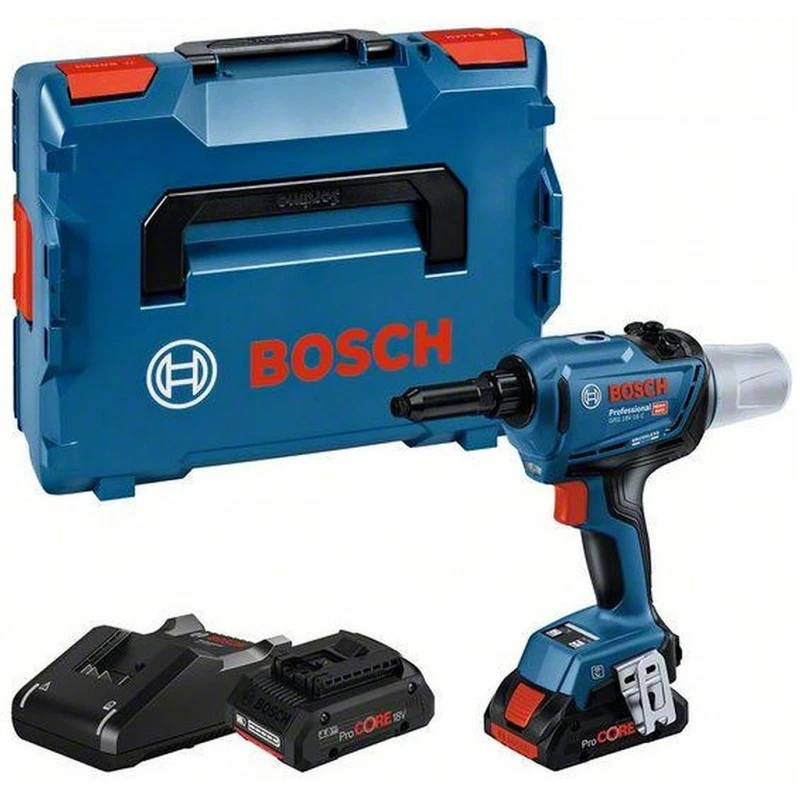 La GRG 18V-16 C Professional permet la pose d’une grande variété de rivets aveugles (3,0–6,4 mm de diametre) avec une force de poussée constante de 16 000 N. Cette riveteuse dispose de deux modes : AUTO pour un rivetage automatique et MANUAL pour contrôler soi-meme l’opération de pose. La Bluetooth connectivity permet de personnaliser l’outil et d’etre informé sur ses besoins de maintenance via l’application Bosch Toolbox.