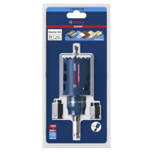 Le kit de démarrage pour scie-trépan de Bosch Expert est composé de scie trépan et ses accessoires. La scie possède une denture en carbure fin et dur, individuellement affuté. La visibilité et l’éjection sont facilitées par la conception des fentes.