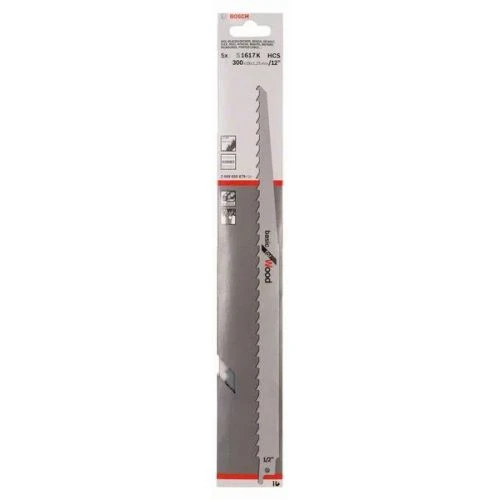 La lame de scie sabre S 1617 K de la marque Bosch prĂ©sente une denture latĂ©rale acĂ©rĂ©e lui permettant de dĂ©couper le bois sans exigence particulière. Elle est en acier Ă haute teneur en carbone (HCS), idĂ©ale pour la coupe du bois dur, du bois rĂ©sineux, du bois de rĂ©cupĂ©ration sans clous, du bois de chauffage et du bois vert. Cette lame possède une capacitĂ© de coupe jusqu’Ă environ 250 mm. De plus, elle est compatible avec les scies sabres avec systèmes d’emmanchement en S.