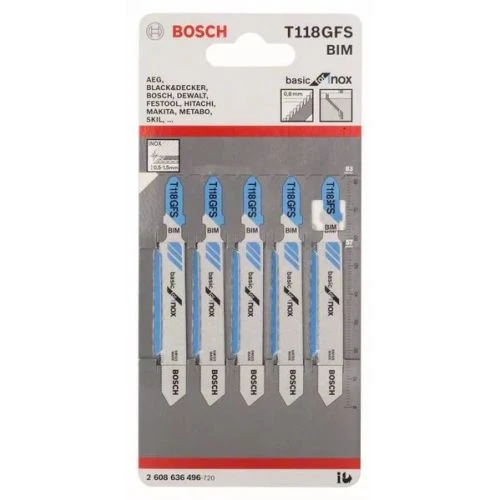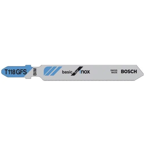 Les lames de scie sauteuse T 118 GFS Basic for Stainless Steel de la marque Bosch sont utilisĂ©es pour des dĂ©coupes rectilignes dans le mĂ©tal. La denture dispose d’une gĂ©omĂ©trie fraisĂ©e et ondulĂ©e Ă pas très fin, conçue pour la dĂ©coupe de l’acier inoxydable très mince (0,5 Ă 1,5 mm). La combinaison bimĂ©tal de la denture progressive en acier trempĂ© Ă coupe rapide (HSS) et du corps en acier Ă haute teneur en carbone (HCS) extrĂŞmement flexible offre Ă la fois la duretĂ© et la flexibilitĂ© dans les travaux de dĂ©coupe.