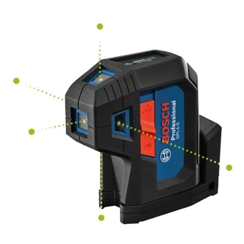 Le laser points GPL 5 G de Bosch est un laser 5 points robuste et compact avec 5 points laser verts très bien visibles. Il offre une visibilitĂ© optimale grâce aux points laser verts, ainsi qu’une grande prĂ©cision pour les poses de cloisons Ă 90° et les reports de points du sol vers le plafond. Il convient Ă©galement pour les applications de plomberie et la construction d’ossature pour cloisons sèches. Pour une manipulation simple et rapide, il est muni d’une interface utilisateur avec un bouton Ă deux positions : lorsqu’il est placĂ© sur ON, l’appareil s’autonivelle automatiquement, quand il est sur OFF, le système pendulaire est bloquĂ©. En outre, ce laser 5 points GPL 5 G est dotĂ© d’un boitier en caoutchouc offrant une meilleure protection contre la poussière et l’eau. Il dispose Ă©galement d’un support rotatif intĂ©grĂ© avec aimants puissants permettant une fixation rapide et fiable sur les surfaces magnĂ©tiques et un transport facile.