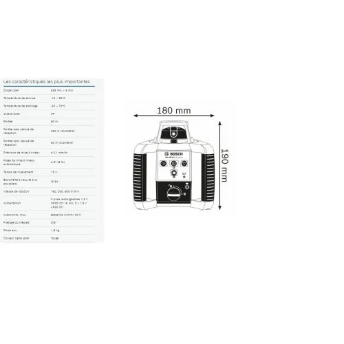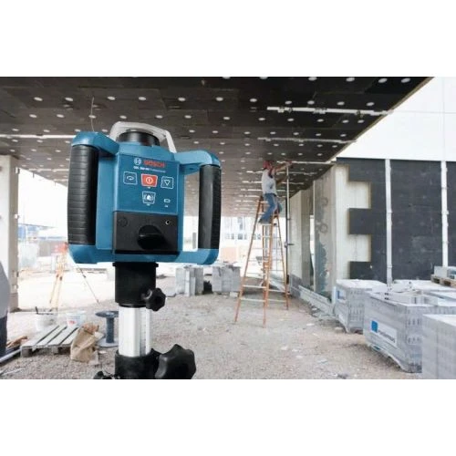 Ce laser rotatif GRL 300 HV Professional de la marque Bosch dispose d’une grande simplicitĂ© d’utilisation. Un bouton suffit Ă l’allumer et les sĂ©lections sont clairement confirmĂ©es sur les Led du clavier. DotĂ© d’une mise en place rapide en mode horizontal et vertical grâce Ă la mise Ă niveau automatique sur 8 % (± 5°), ainsi que d’un anti-chocs activable pour Ă©viter toute erreur de mesure en cas de vibrations ou de secousses.